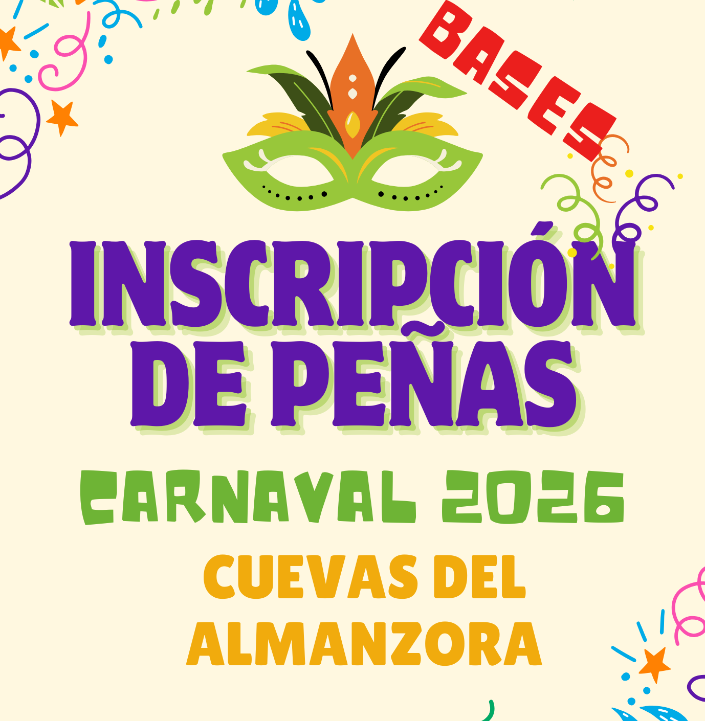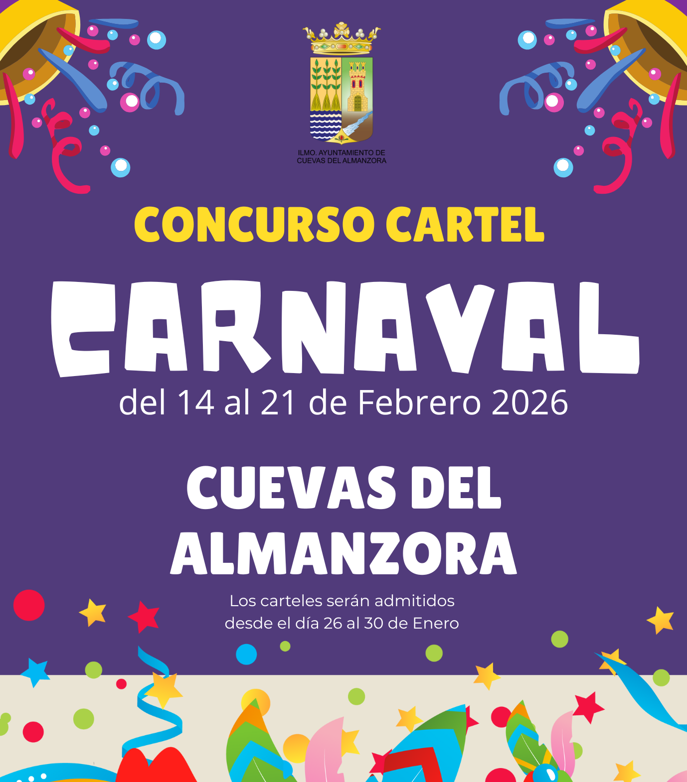 BASES DE INSCRIPCIÓN DE PEÑAS DE CARNAVAL 2026 22/01/2026 El Ilmo. Ayuntamiento de Cuevas del Almanzora publica las bases para la participación en los desfiles de las Fiestas de Carnaval del año 2026: