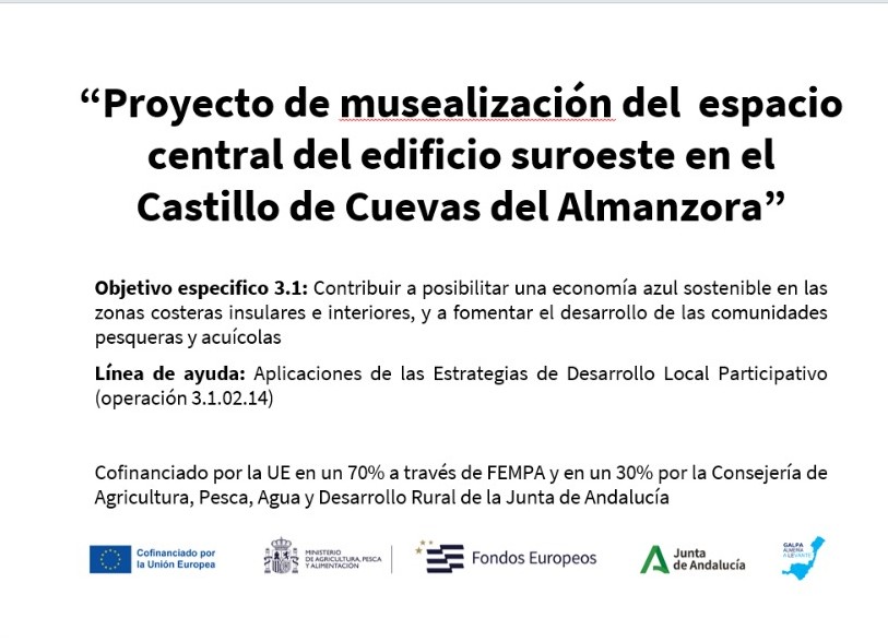 “Proyecto de musealización del espacio central del edificio suroeste en el Castillo de Cuevas del Almanzora” 10/12/2025 Breve descripción del Proyecto: La actuación tiene por objeto ejecutar el proyecto de musealización del espacio central del edificio suroeste en el castillo de Cuevas del Almanzora. Esta intervención contempla la creación e instalación de mobiliario para la adecuación de recursos museográficos y equipos informáticos, la elaboración de un audiovisual y paneles interpretativos, entre otros recursos.